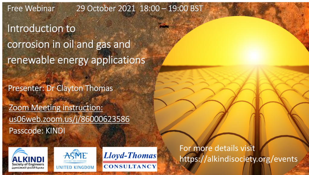 We are delighted to host Dr Clayton Thomas who will present an introduction seminar on corrosion in oil and gas and renewable energy applications. The session will be useful for those working in engineering, production and design who manufacture or supply engineering components and it will help them to gain an improved understanding of material specification and selection. The event will be jointly held with the American Society of Mechanical Engineers – United Kingdom Section.