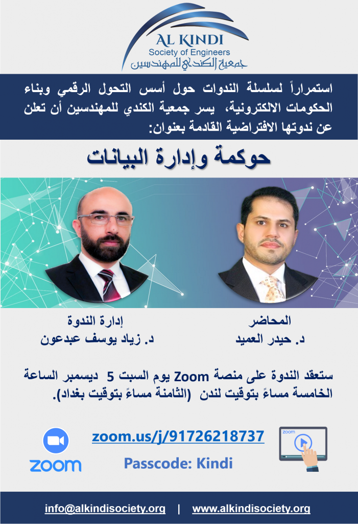 تهدف الندوة إلى التعريف بمفاهيم الحوكمة وإدارة البيانات الحكومية والتعريف بأهمية البيانات وكيفية إدارتها وحوكمتها بناء على أفضل الممارسات. وتوضيح المبادئ ومجالات العمل وأليات التعامل مع البيانات، وزيادة جودة وقيمة البيانات، والمحافظة على البيانات الحساسة، وحماية البيانات الشخصية. تتضمن الجلسة عرض تجارب بعض الحكومات في صياغة وتطبيق استراتيجية وأطر حوكمة البيانات كجزء من خططها للتحول الرقمي