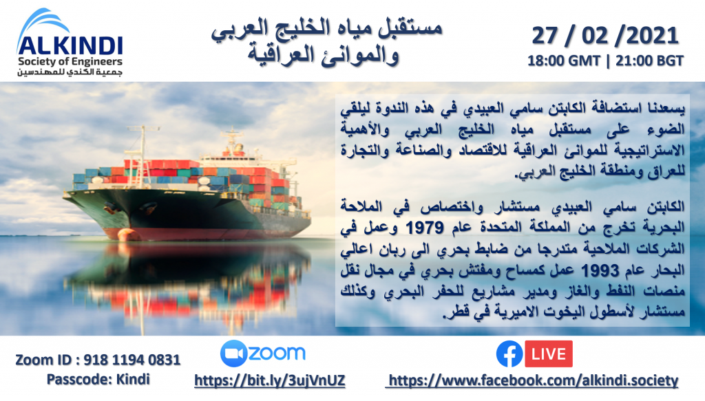 يسعدنا استضافة الكابتن سامي العبيدي في هذه الندوة ليلقي الضوء على مستقبل مياه الخليج العربي والأهمية الاستراتيجية للموانئ العراقية للاقتصاد والصناعة والتجارة للعراق ومنطقة الخليج العربي